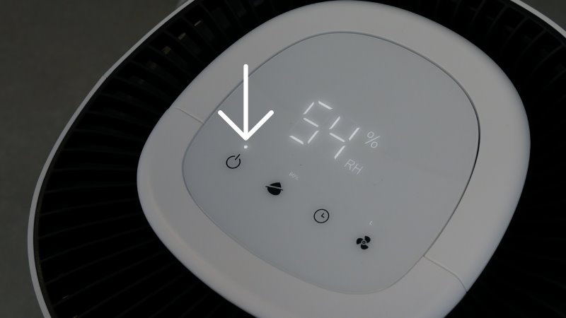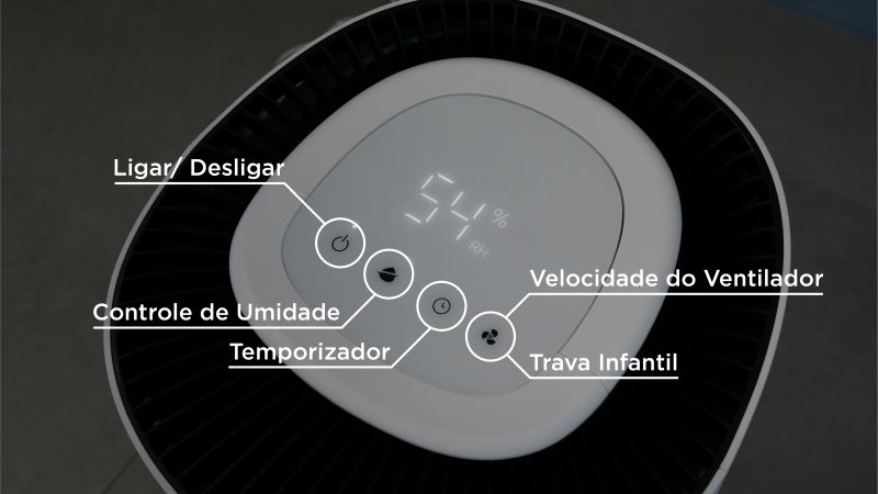 O display tem capacidade para dois dígitos, além do símbolo de porcentagem e RH (sigla de umidade relativa em inglês). Ao lado, dois avisos podem aparecer: reservatório cheio e Trava Infantil. Os botões são os seguintes:
