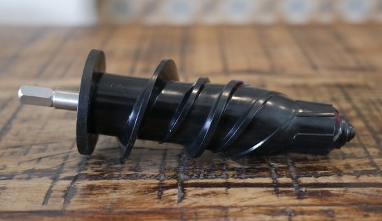 O produto que utilizamos aqui é o F-9600 GreenIS importado pela Frugal Eletro. Todas as peças do produto são de ótima qualidade. Somente para dar uma ideia, essa rosca que empurra os alimentos tem uma camada externa plástica, mas está cobrindo uma peça grande de inox. Somente essa peça pesa mais de 350 gramas!