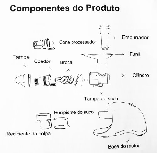 O espremedor é composto por várias peças. São todas simples de encaixar, mas não deixa de ser trabalhoso o processo. Abaixo estão todas as peças que fazem parte da coleta e extração do suco