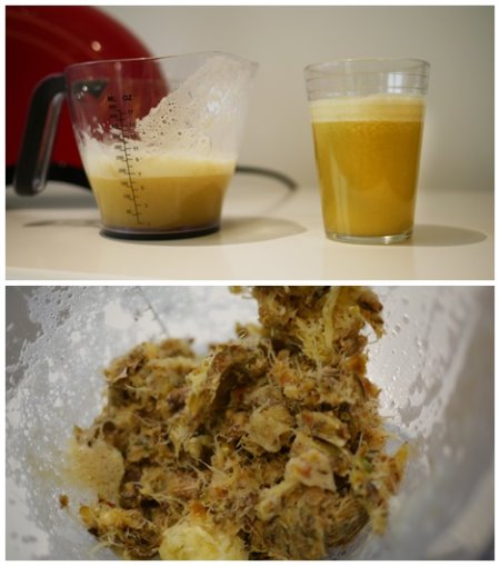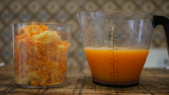 Os sucos cítricos foram muito bem. A cenoura tem fibras pequenas e quando espremendo ajuda o bagaço a sair com facilidade. Quando fazendo 850 gramas de laranja e cenoura, foi obtido 570ml de suco. Do outro lado sobrou o bagaço muito seco, sem nenhuma gota no fundo do recipiente.