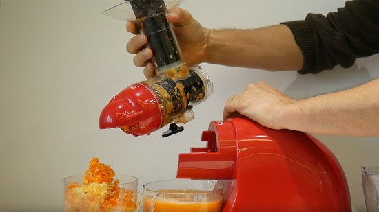 Os espremedores de baixa rotação na vertical espremem o suco de cima pra baixo, os modelos horizontais realizam o trabalho de lado a lado, porém em ambos os casos o mecanismo de funcionamento é parecido, onde o alimento é empurrado através de uma broca para passar em um espaço pequeno. Nesse processo de prensar o alimento pelos furos do coador sai o suco por uma saída e sólido do alimento por outra.