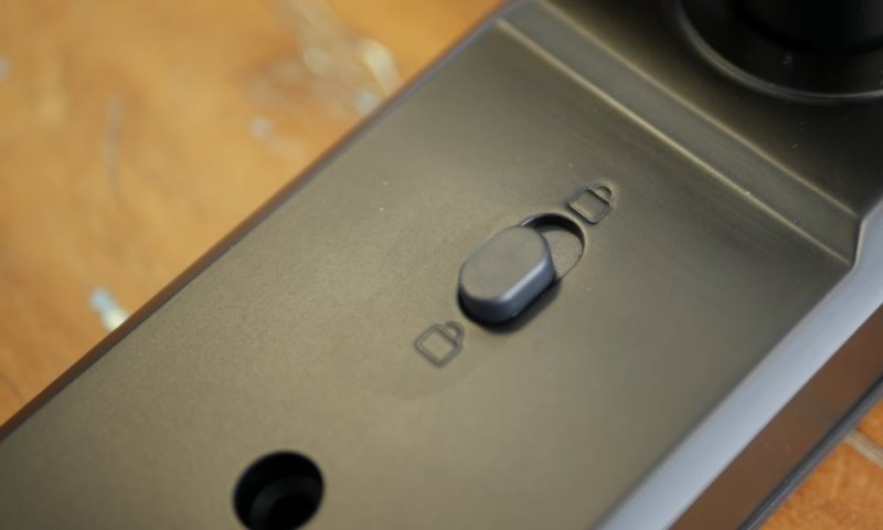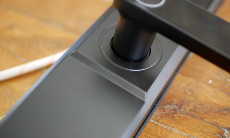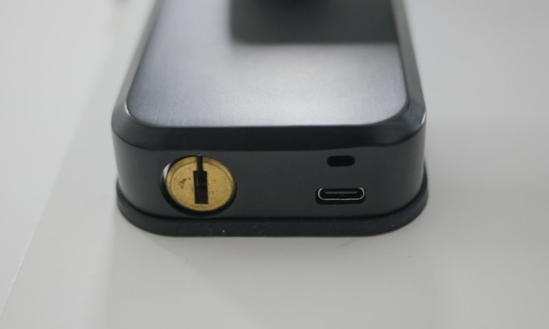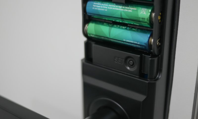 Abaixo da fechadura há um espaço para inserção de uma chave mecânica para poder abrir a porta mesmo sem haver energia no dispositivo. Ali também há um plug USB-C para caso acabe a pilha do produto ainda seja possível alimentá-la e acionar via identificação digital.