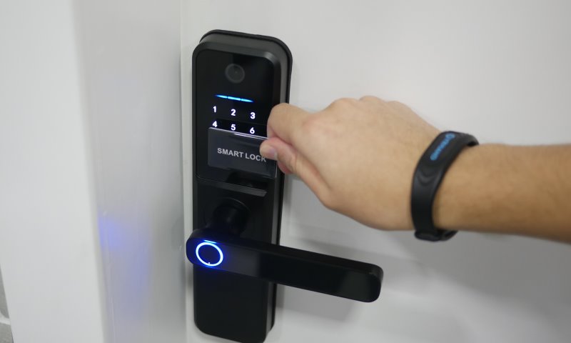É possível usar seis meios diferentes para abrir a porta: leitura da digital pela biometria do trinco, senha numérica de 6 a 8 dígitos, leitura de tag, chave tradicional, liberação remota via aplicativo e geração de senha remota via aplicativo.