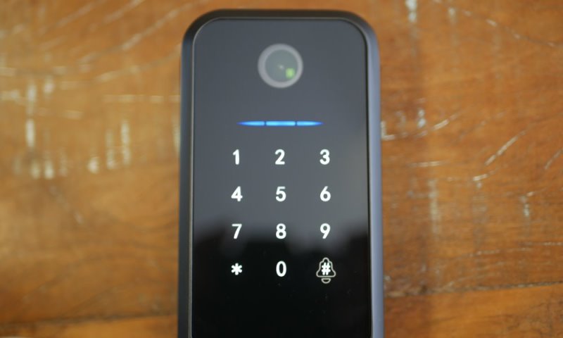 No lado da fechadura voltado para a parte externa da casa há um sensor biométrico na maçaneta, onde tipicamente se encosta o dedo polegar. Ao redor dele tem um LED, que ilumina quando alguma ação é solicitada ou quando se busca fazer uma comunicação com o usuário. Acima do trinco há um teclado numérico. É uma peça visualmente agradável com iluminação dos números em LEDs brancos. Acima dos botões há uma fileira de LEDs coloridos que também fazem uma certa comunicação com o usuário similar à iluminação do sensor biométrico. Além disso no topo fica uma câmera para poder capturar quem está na porta e mostrar via aplicativo.