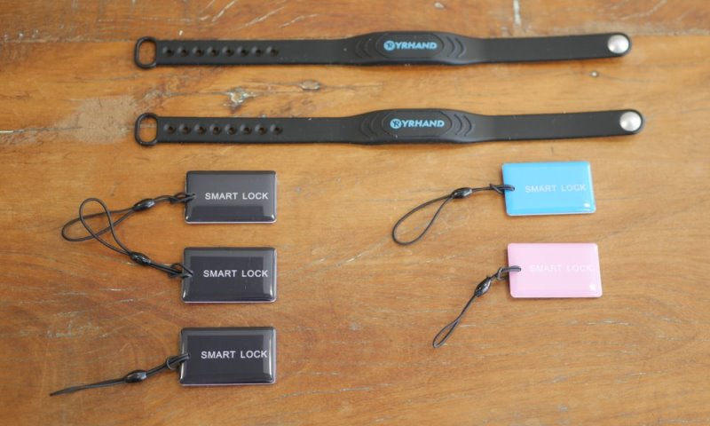 Junto com a fechadura vem duas chaves para acionamento mecânico, 7 tags (RFID), sendo 5 pequenas e duas grandes, além de duas pulseiras. São peças bem feitas, com um barbante nas tags para pendurar em chaveiros e as pulseiras de silicone com ajuste para o pulso.