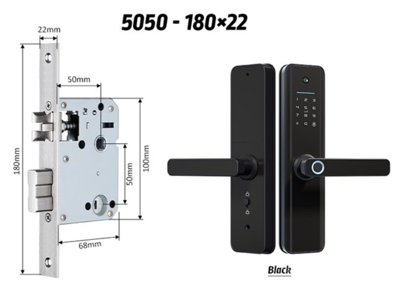 A fechadura que testamos aqui é o modelo 5050 - 180mm por 22mm de largura. Na imagem abaixo é possível ver essa cota na porta.
