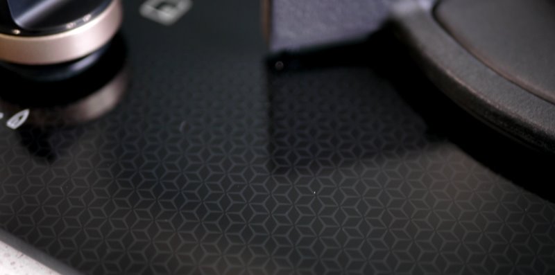 A mesa em si deixa marcas de dedos com facilidade, muito similar a qualquer mesa de vidro escura. Os desenhos no preto ajudam a mascarar um pouco da sujeira. A pintura preta vai até perto de 3 milímetros das bordas, deixando uma pequena área transparente. Isso parece ser padrão nos produtos com mesa de vidro, mas ainda sim, é bom lembrar que colocando em uma bancada clara a sujeira irá aparecer com frequência.