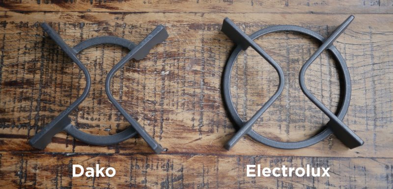 Apesar de similares, não são peças intercambiáveis entre as marcas. A trempe central, onde fica a chama tripla, é diferente e agradou. Todas as trempes ficam assentadas sobre seus suportes, mas assim mesmo todas as pontas tem uma borracha na base, para evitar o toque no vidro caso uma panela seja tirada demais do centro e force a trempe a se deslocar.