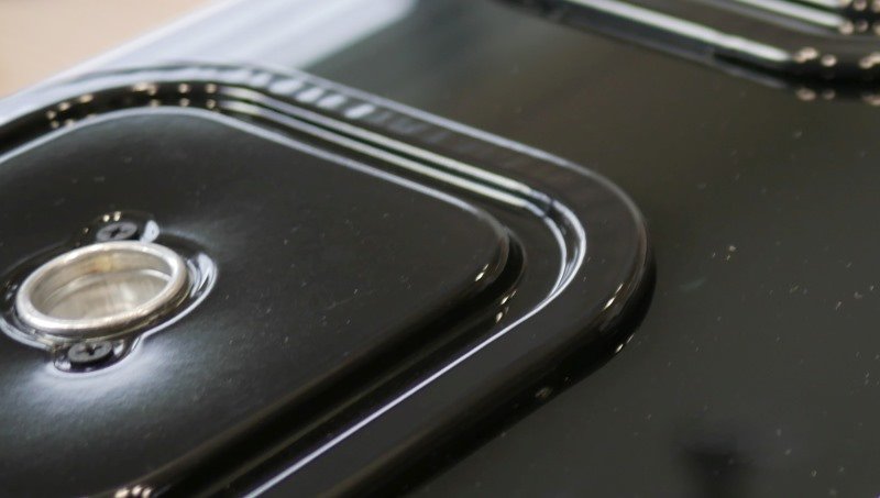 Diferente dos fogões com mesa de vidro, os cooktops da Mueller não possuem borda nos cantos, seguindo o padrão dos produtos do mercado, onde basicamente a mesa de vidro é a única peça no topo. A foto abaixo é do canto do fogão Mueller Piacere Vetro.