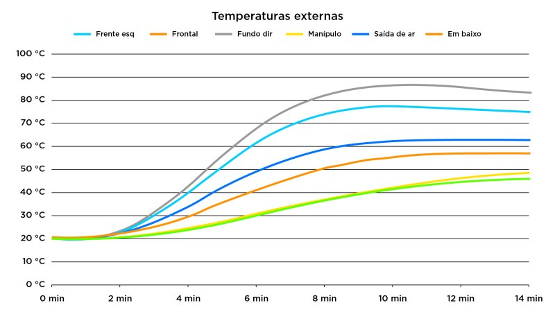 Tome cuidado onde for pegar no produto quando ele estiver ligado. Em pontos comuns a temperatura chegou a 87°C, mas isso sem considerar a chapa de aquecimento e arredores imediatos. Próximo do centro a temperatura dispara e fica realmente perigoso, com riscos de queimaduras. Prefira pegar por baixo ou laterais, que atingem por volta de 50°C e 65°C respectivamente.
