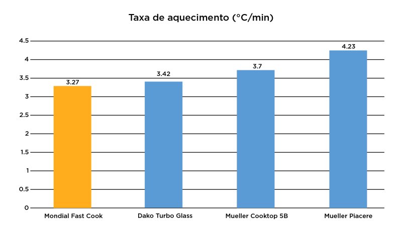 Realizamos o mesmo tipo de teste que fazemos com fogões e cooktops, utilizando de uma panela padrão para ferver 2L de água, e os resultados foram interessantes. Em sua potência máxima, o Fast Cook apresentou uma taxa de fervura abaixo de todos os outros fogões que testamos até então, com 3,3°C/min e levando 21 minutos para atingir o ponto de fervura da água. Mesmo assim o resultado não é totalmente ruim ou fica tão atrás das bocas de 1000W e 1200W testadas, mesmo entregando (essencialmente) 550W.