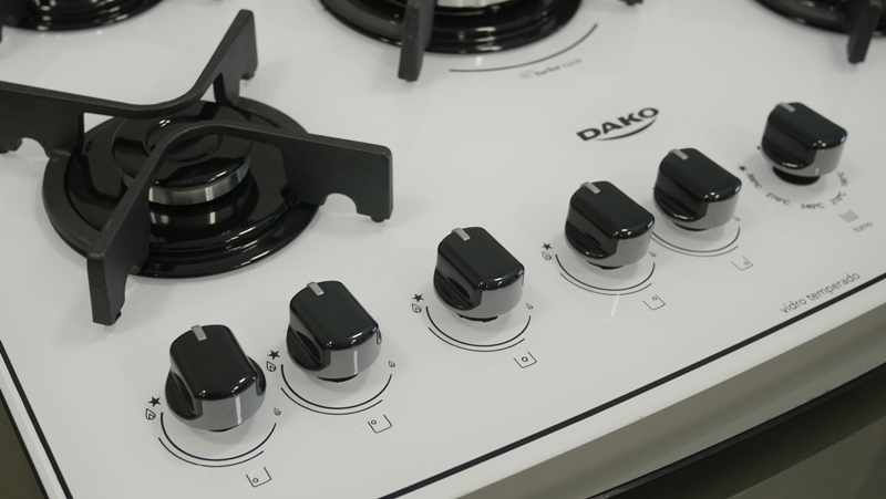 Apesar da mesa ser mais profunda que na maioria dos fogões, alguns manípulos ainda ficaram perto dos queimadores. Seria interessante se a Dako tivesse aproveitado um pouco mais a mesa para dar pelo menos mais um centímetro de distância da boca da esquerda.