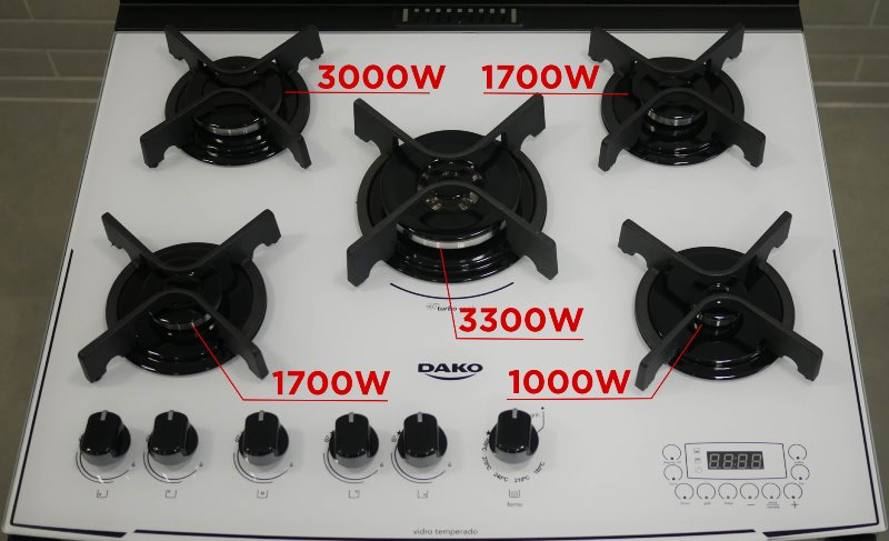 Os queimadores são de ótima qualidade e a Dako soube muito bem distribuir o tamanho das bocas para atender a qualquer gosto. Há uma variedade de potências e um queimador bem potente no centro com 3 chamas para a distribuição homogênea do fogo.