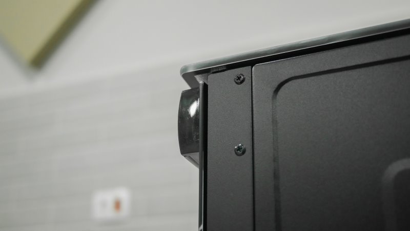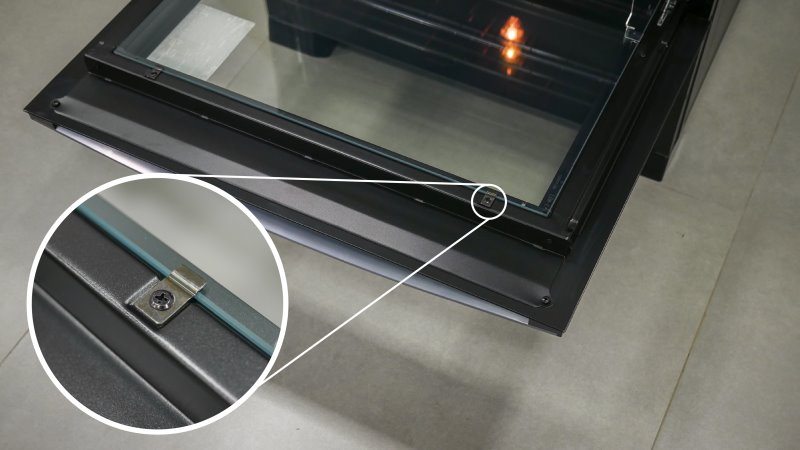 As laterais são chapas de aço pintadas de preto. Não chega a ser destoante do vidro, mas a junção entre elas deixa parafusos à mostra. Não afeta a estética do fogão, mas poderiam ter feito um trabalho melhor para esconder os parafusos.