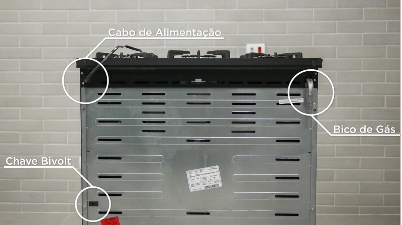 A instalação deve ser pensada para atender o usuário, e a Dako optou em colocar o cabo de alimentação na traseira direita do fogão com sua chave bivolt logo abaixo.