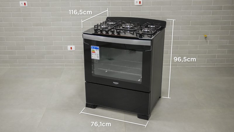 O fogão possui uma altura máxima de 96.5 cm, uma largura de 76.1 cm e uma profundidade de 62.8 cm. No entanto, quando aberta a porta o fogão, atinge uma profundidade de 116.5 cm.