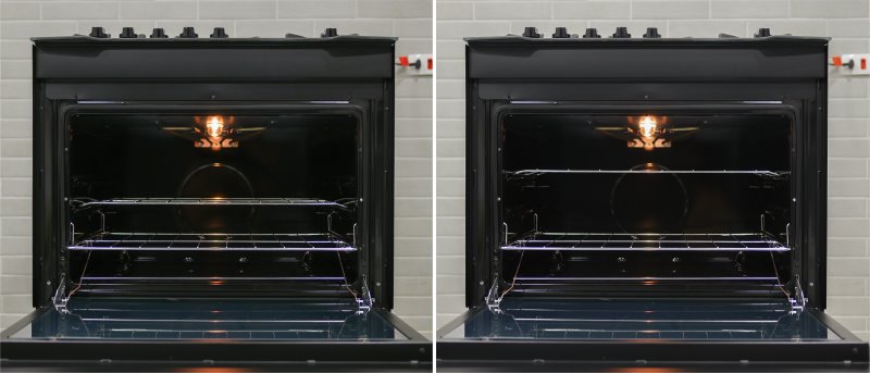 No forno, a limpeza não é um empecilho para as superfícies esmaltadas. Entretanto, o topo galvanizado vai pedir um cuidado a mais se quiser evitar manchas ou ferrugem. Isso pode ser difícil de realizar já que a resistência fica próxima da chapa e atrapalha na hora de alcançar lugares estreitos.