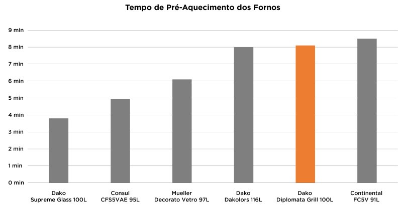 Há mudanças de temperatura entre regiões diferentes no forno. Isso é comum. O Dako Diplomata registrou uma diferença máxima de 12°C, poderia ser melhor, mas possui uma boa distribuição de temperatura se comparado a outros produtos de mesma capacidade.