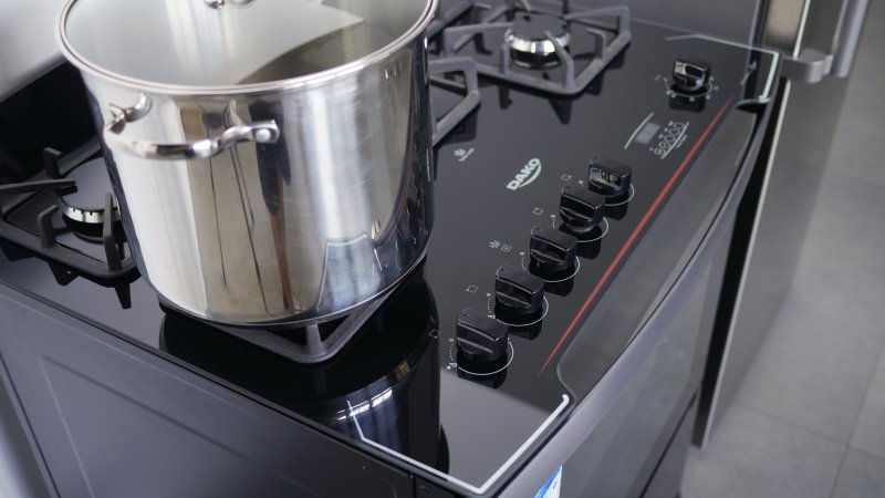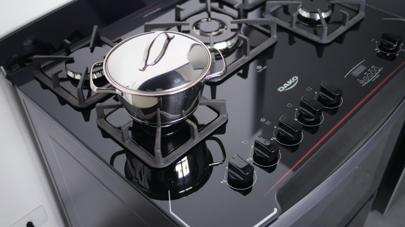 O Fogão Dako diplomata 5Q Grill é um fogão anunciado com 100L de volume de forno. Sua construção chama a atenção principalmente para a mesa: feita de vidro temperado e pintada de preto, com detalhes em branco e vermelho.