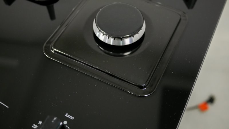 Os manípulos, feitos de PBT, um plástico para altas temperaturas, ficam localizados na mesa de vidro a uma boa altura da mesa. De certa forma são simples, mas ficam bem encaixados e firmes.