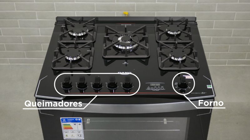 Com um item de segurança importantíssimo para o fogão, a Dako inclui um Corta Gás, evitando vazamentos de gás na região do forno para quando houver algum apaziguamento das chamas. Para acender o forno é necessário manter o manípulo pressionado por 10s.