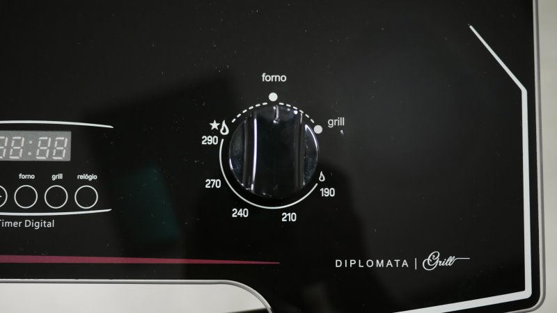 No manípulo do forno temos a possibilidade de regularmos a temperatura de 190°C até 290°C, com 3 posições intermediárias: 210°C, 240°C e 270°C.