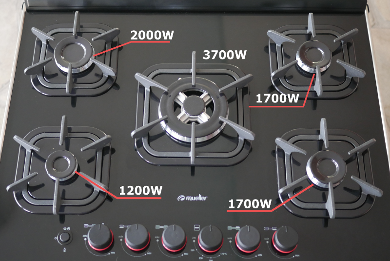 Os queimadores das bocas menores são simples, com bom acabamento, mas bem finos em alumínio. A chama tripla possui um queimador diferente de qualidade superior e foi projetada pela Mueller. É uma peça de ótima qualidade. Os distribuidores da chama são de ferro fundido esmaltado.