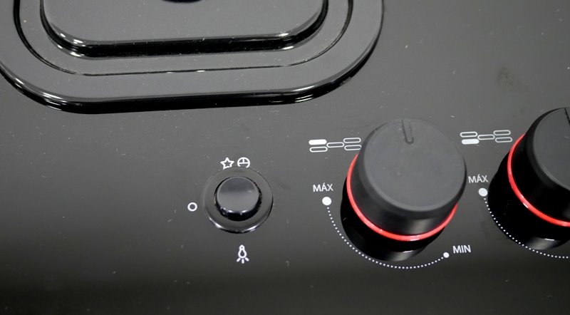 Os manípulos ficam todos concentrados no centro da mesa. São peças de boa qualidade com textura emborrachada. É um pouco confusa a distribuição, pois, o manípulo do forno fica no meio dos manípulos da mesa.