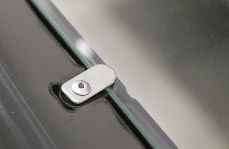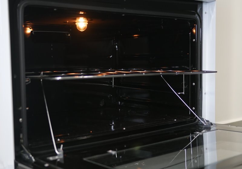O forno possui vidro duplo, mas não é possível remover um dos vidros para fazer uma limpeza completa entre as peças. As travas do vidro estão rebitadas na porta.