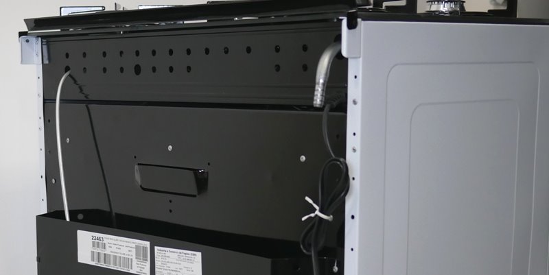O cabo de alimentação é de 95 centímetros e sai do lado esquerdo do forno, logo abaixo da entrada de gás.