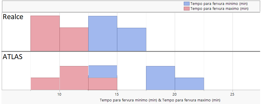 Sendo assim este fogão é forte, tendo pouca flexibilidade na intensidade do calor. Seu intervalo de temperaturas é até menor que o Atlas Agile Glass (que é um fogão de médio para forte), sem bocas pequenas. Abaixo são os tempos de fervura do Realce e do Atlas Agile Glass na potência máxima e mínima de cada boca