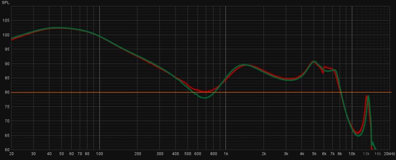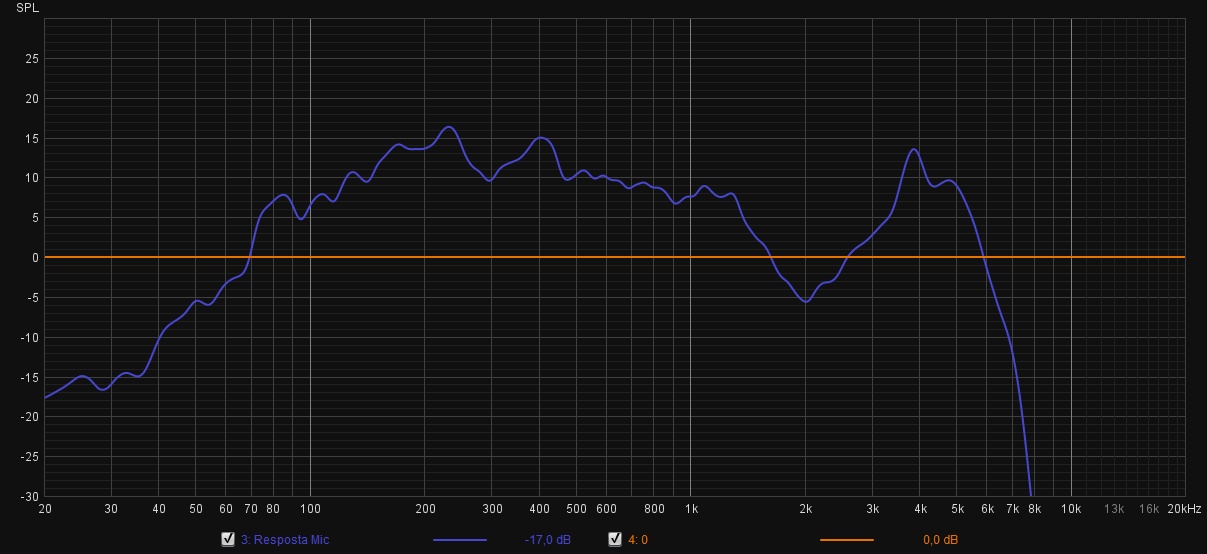 Abaixo está a captação do microfone através do espectro de frequência audível. O ideal seria seguir ao máximo a linha de referência, mas algumas faixas de frequência ficam recuados enquanto médios e uma faixa específico dos agudos (pico à direita) se sobressaem. A queda repentina na frequência de 8 kHz retira algumas sutilezas do diálogo, atrapalhando alguns sons com "S" por exemplo.