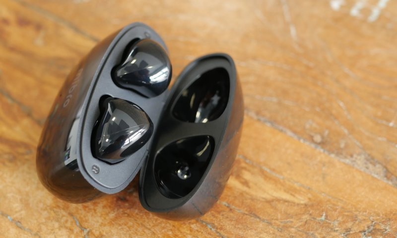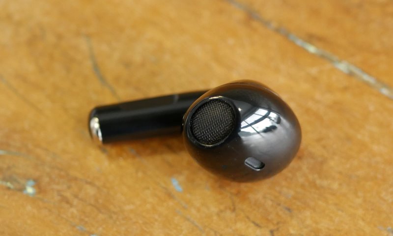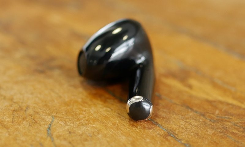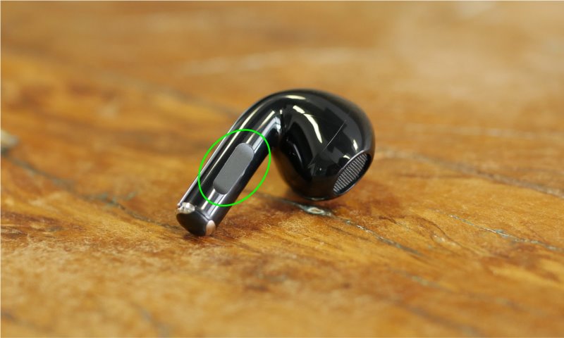 No fone em si há pouquíssimos detalhes, na cabeça ele tem somente a grade por onde sai o som e um pequeno respiro na lateral. Nas hastes aparecem os botões, tanto no da direita quanto no da esquerda, por onde é possível fazer algumas ações. Logo abaixo os fones possuem os contato usados pra carregar no estojo.