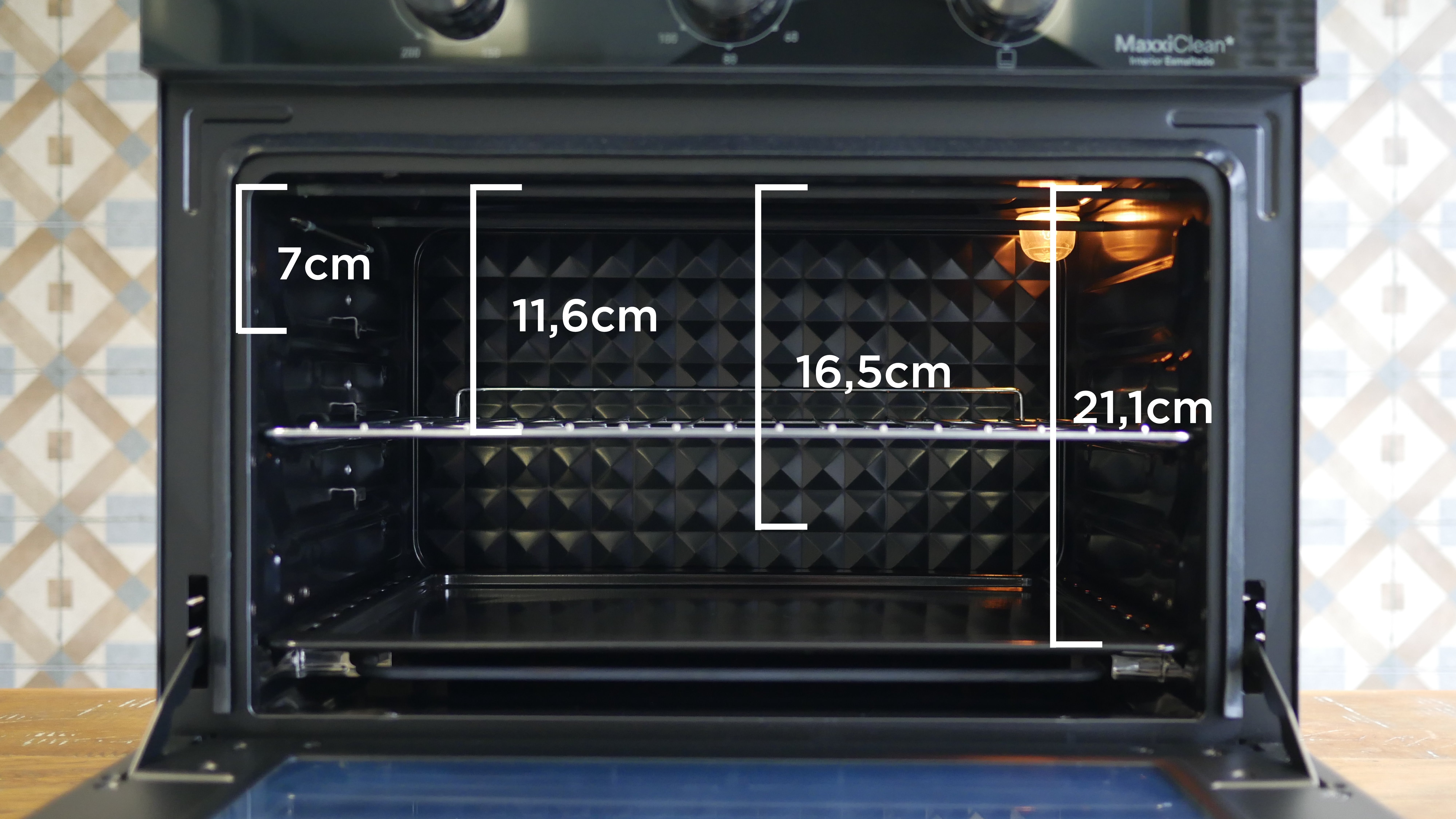 Este forno tem 4 níveis disponíveis para colocar os acessórios, porém o nível mais baixo é bem próximo da resistência e provavelmente será mais usado para acomodar a bandeja, que também tem o papel de distribuir melhor o calor dentro do forno. Segue abaixo a distância até a resistência superior de cada nível disponível: