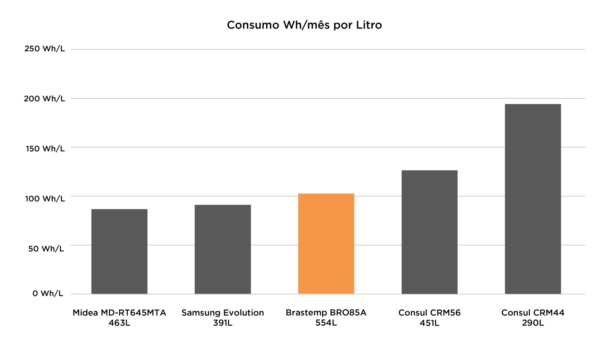Este Brastemp é declarado com 56.6 kWh/mês de consumo, um valor bom para um produto com volume acima de 500 Litros. Comparando com as diversas outras geladeiras já testadas, está fica entre os mais econômicos considerando seu tamanho.