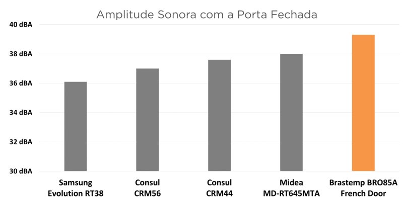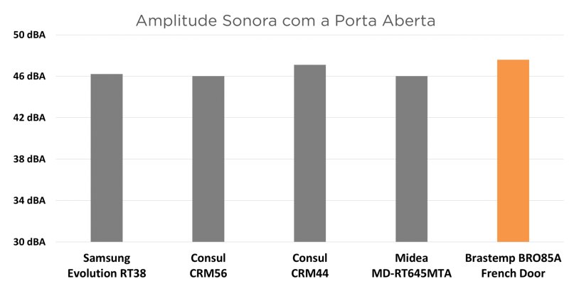 Porém, apesar de detectarem a porta aberta, não desligam o ventilador quando isso acontece. Então a amplitude sonora que está em torno de 39 dBA com a geladeira fechada vai para 47 dBA quando a porta abre.