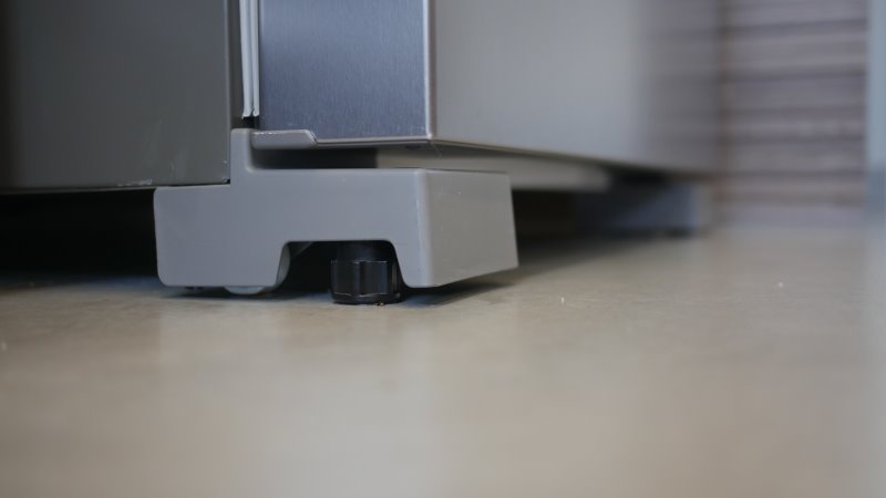 Junto com as rodas da frente, vem também dois pezinhos para travar a geladeira no chão e evitar de deslizar quando abrindo as portas. Funcionam bem.