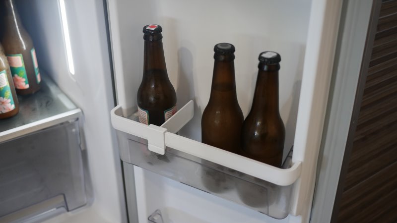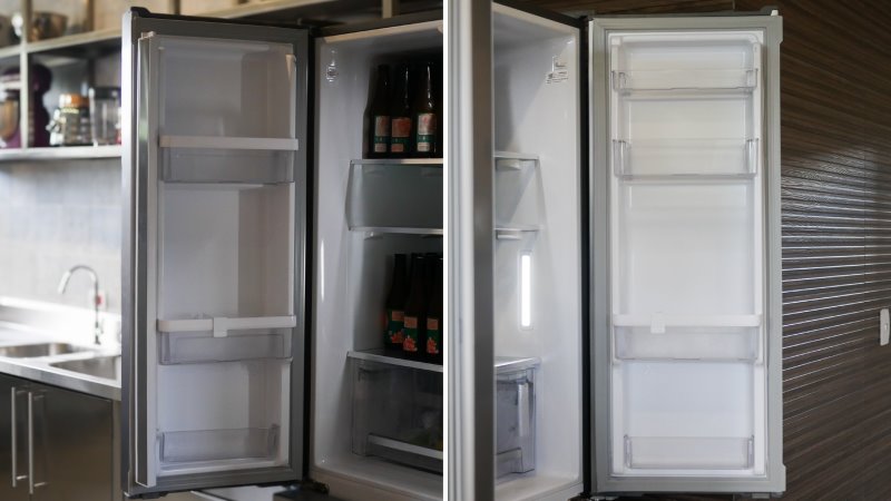 Algo diferente desta unidade é a ausência de um compartimento extra frio, algo que vemos com frequência em vários refrigeradores atuais. Outra peculiaridade é que a área mais fria do refrigerador é a gaveta, que tipicamente é usada para frutas e legumes.