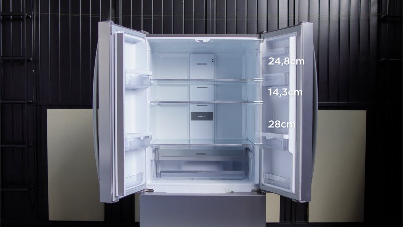 A configuração que temos aqui é tipicamente chamada de “french door”: duas portas, e o freezer como uma única porta embaixo. Além de ser frost free e também possuir a tecnologia inverter, que economiza energia.