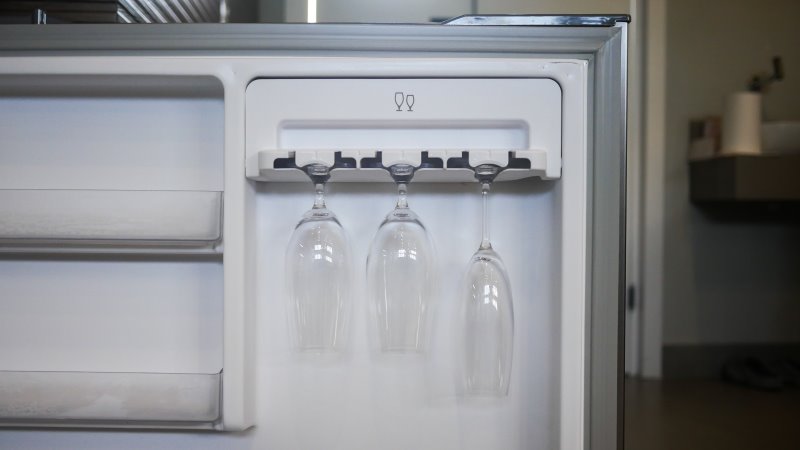 Na porta, a Brastemp também colocou um espaço para gelar taças com um encaixe da base para deixá-las de cabeça para baixo.