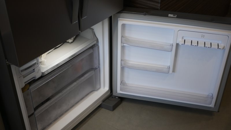 Na cavidade interna há uma área exclusiva para a fabricação de gelo, e logo ao lado uma prateleira grande que pode facilmente ser puxada para acessar os alimentos dentro.