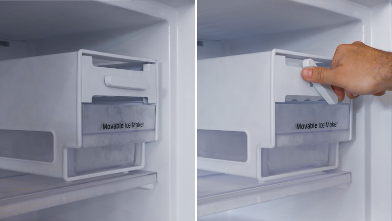 Dentro do freezer também vem uma caixa móvel para fazer gelos e despejá-los em uma bandeja. É possível esvaziar as bandejas de gelo facilmente girando o pegador posicionado na frente.