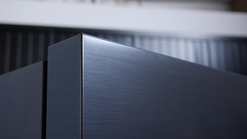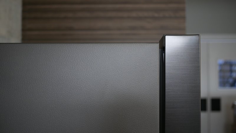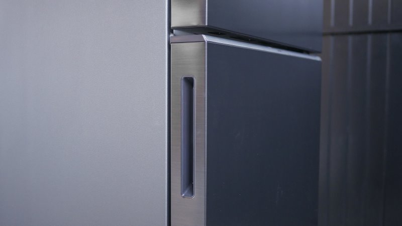 É curioso, pois é um produto minimalista, com destaques nas sutilezas como a cor e textura da chapa metálica das portas do produto, assim como o detalhe chanfrado cromado entre as portas. É um conjunto com ainda menos detalhes que sua versão anterior, que vinha com o painel no meio do freezer e algumas curvas para demonstrar os pegadores embutidos.