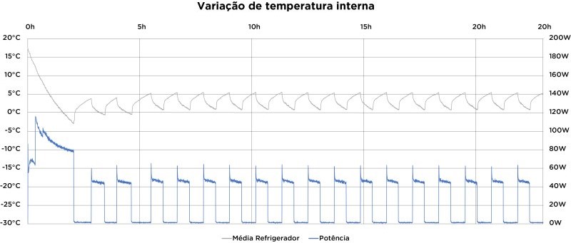 O sistema inverter, de controle da velocidade do compressor é bom, mas ainda esperava-se mais. A potência de trabalho na demanda máxima gira em torno de 100W e a potência mínima de trabalho fica em torno de 50W. Caso precise de menos potência, o compressor é desligado. Nessas horas o que acaba gerando é aquele dente de serra na variação de temperatura interna, longe de uma temperatura estável.