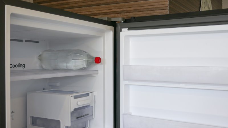 O freezer tem 97 Litros com uma prateleira de plástico rígido transparente (PS cristal) e duas prateleiras na porta. É possível colocar a prateleira do freezer em duas alturas. Se colocada na prateleira mais alta é possível colocar garrafas de 2 litros com a tampa para frente e a porta irá fechar, diferente do Midea e os Consul testados no passado.