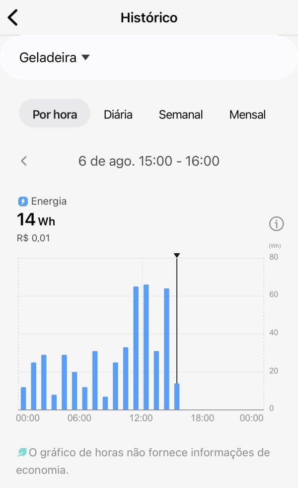 O monitoramento de consumo é uma das funções mais interessantes do produto. A cada hora é computado o dado e é possível ver esse gráfico ao longo do mês e gastos dos meses anteriores.