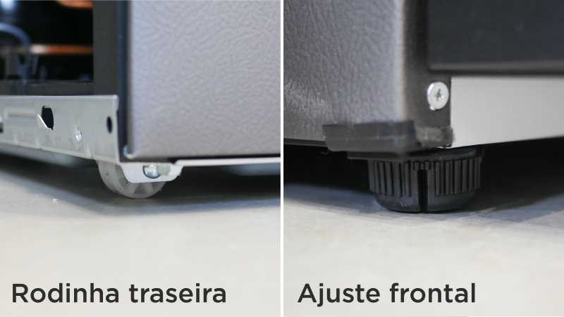 A unidade tem duas rodinhas na traseira e dois pés reguláveis na frente. Não é muito fácil de arredar para limpar se estiver cheia.