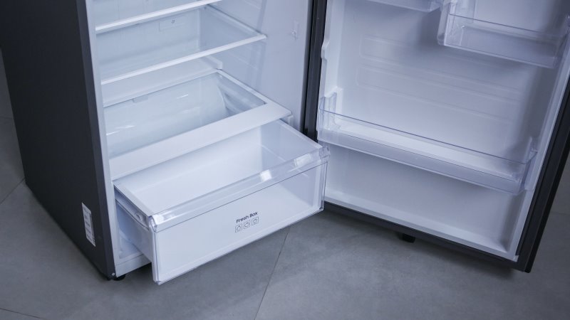 A gaveta de legumes se estende até quase a porta. Isso maximiza o volume da gaveta, porém joga a prateleira de bebidas da porta mais para cima. É um conceito que os asiaticos estão trazendo com mais frequência. O volume total da "Fresh Box" como a Samsung chama é de quase 26 Litros.