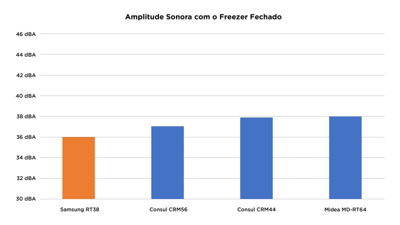 O ruído da unidade é baixo, bem baixo. Com o compressor ligado, ficou em 36 dBA. Somente quando o freezer é aberto e o refrigerador está fechado que o ruído fica alto, pois o ventilador interno não desliga. Nessas horas o ruído chega a 43 dBA. Isso poderia ser evitado se tivesse a detecção da porta do freezer aberta. É a geladeira mais silenciosa testada até o momento.