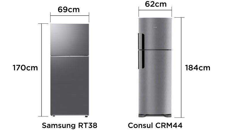 O RT38 tem uma configuração interessante, pois a Samsung deu prioridade para a largura de seu produto ao invés da altura, como na maioria das geladeiras de volume similar no mercado. Comparando com o Consul CRM44 que testamos no passado, o Samsung chega a ser mais de 10 centímetros menor, porém está na largura de geladeiras acima de 400 Litros.